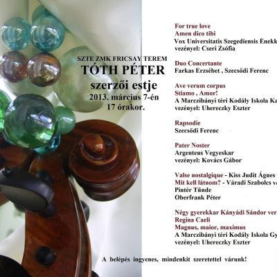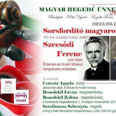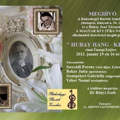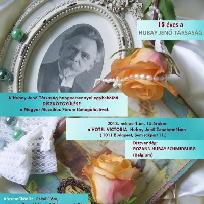 20132013.05.31.A magyar hegedű ünnepe, 2013. május 31 - június 1.Szecsődi FerencBudapest2013.05.04.A Hubay Jenő Társaság hangversennyel egybekötött DíszközgyűléseSzecsődi FerencBudapest2013.03.07.Tóth Péter szerzői estjeSzecsődi FerencSzeged2013.01.19."Hubay hang - kép" - ünnepi est Szecsődi FerencBudapest